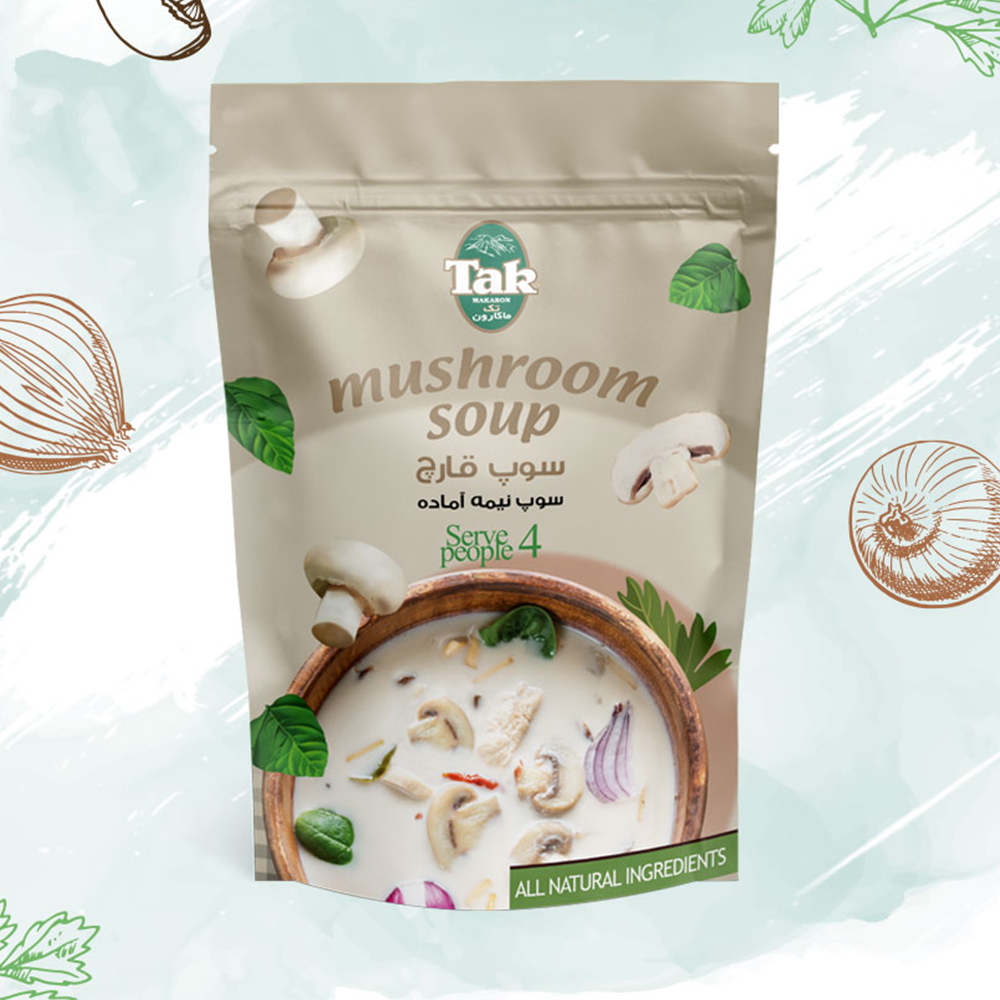 آرد سمولینا، قارچ، پودر سیب زمینی، شیرخشک، عصاره مرغ، سبزیجات (هویج ،پیاز ،جوزهندی، جعفری، گشنیز)، پودر پنیر پارمزان، نمک، فلفل