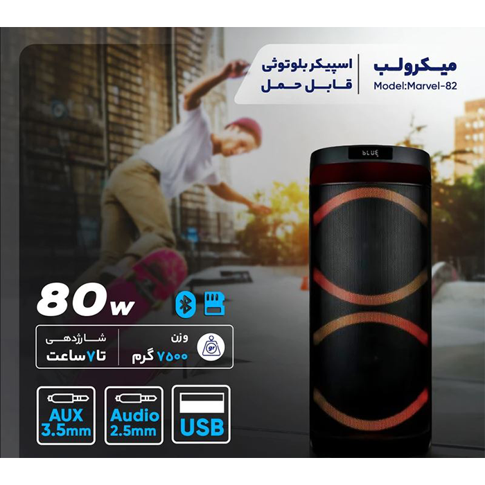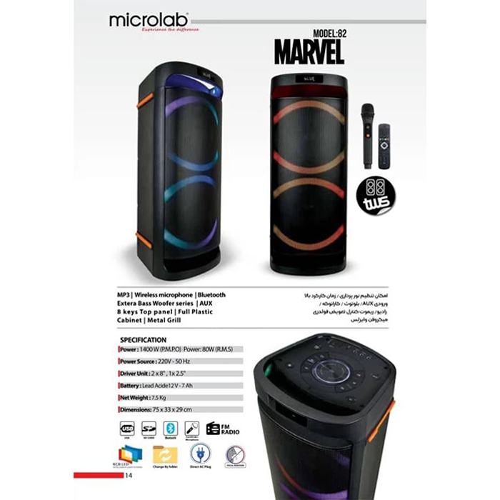 امکان تنظیم نورپردازی / زمان کارکرد بالا / کارائوکه / رادیو/ ریموت کنترل تعویض فولدری / میکروفن وایرلِس/ ورودى برق مستقیم