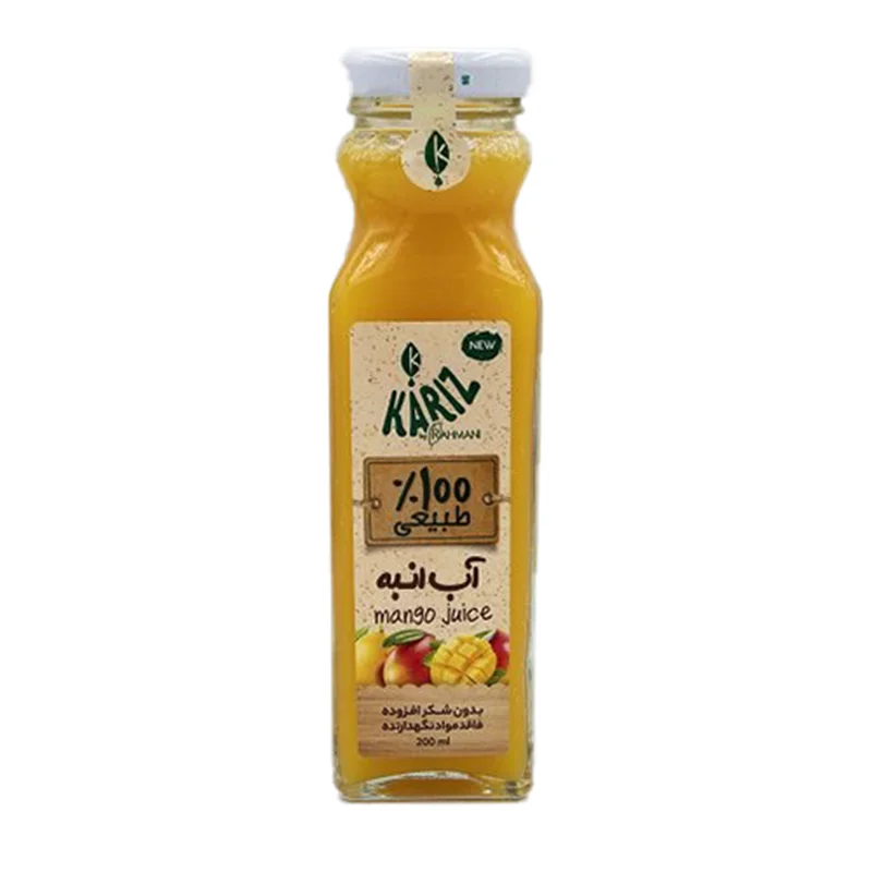 آبمیوه انبه ۱۰۰% طبیعی کاریز برگرفته از مرغوبترین پوره میوه انبه و کاملا سالم و طبیعی بوده و هیچ گونه افزودنی، شکر و نگهدارندهای به آن اضافه نشده است. محصول نوشیدنی انبه کاریز سرشار از فیبر، ویتامین K، ویتامین C، ویتامین E و آنتی اکسیدان می باشد. این آبمیوه حاوی هیچگونه مواد نگهدارنده یا افزودنی مصنوعی نیست و کاملاً طبیعی در بسته بندی شیشه ای عرضه می گردد.